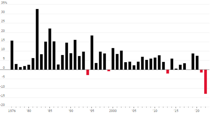 The fourth quarter of 2022 completed a tumultuous financial year with moderately better results than were observed in prior quarters. Although no substantial gains occurred, major indices (DJIA, NASDAQ, S&P 500, and Russell 2000) saw relatively stable results throughout the quarter. However, looking at the financial year as a whole, 2022 was riddled with poor performance as a prolonged volatile bear market took hold and prospects of a recession loom into 2023. Excluding the DJIA, most other major indices saw double-digit losses throughout the year. Furthermore, bonds, which typically are viewed as a safe-haven investment, delivered unprecedented losses. The Bloomberg U.S. Aggregate Bond Index, an index measuring the investment-grade bond market, returned -13.01%, which is by far the worst calendar year performance since the index’s inception in 1976 (See Figure 1 below).1 This poor performance is primarily due to the inverse relationship between bond prices and interest rates. The U.S. Federal Reserve sought to combat stubborn inflation by increasing interest rates at an unprecedented rate, thus driving down bond values. Outside of traditional investments, other securities such as Special Purpose Acquisition Companies (SPACs), Crypto, and NFTs have also plummeted in value. Many investors are reevaluating their portfolios as the fear of a looming recession has increased.2
